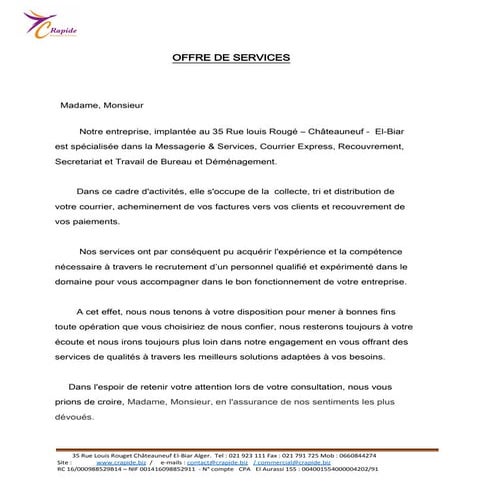 Elementi di una buona lettera commerciale francese Componenti di una lettera commerciale francese La data di scrittura L'indirizzo del destinatario Il saluto o il saluto Il corpo della lettera, sempre scritto al plurale più formale you ( vous ) Un educato pre-chiusura (opzionale) La chiusura e la firma Nelle lettere commerciali francesi, è meglio essere il più educati e formali possibile.