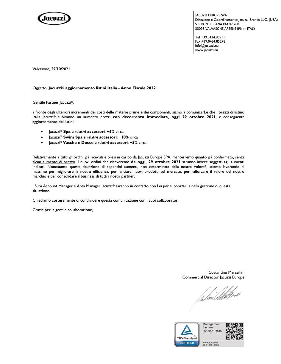 Lettera per aumento listino prezzi
